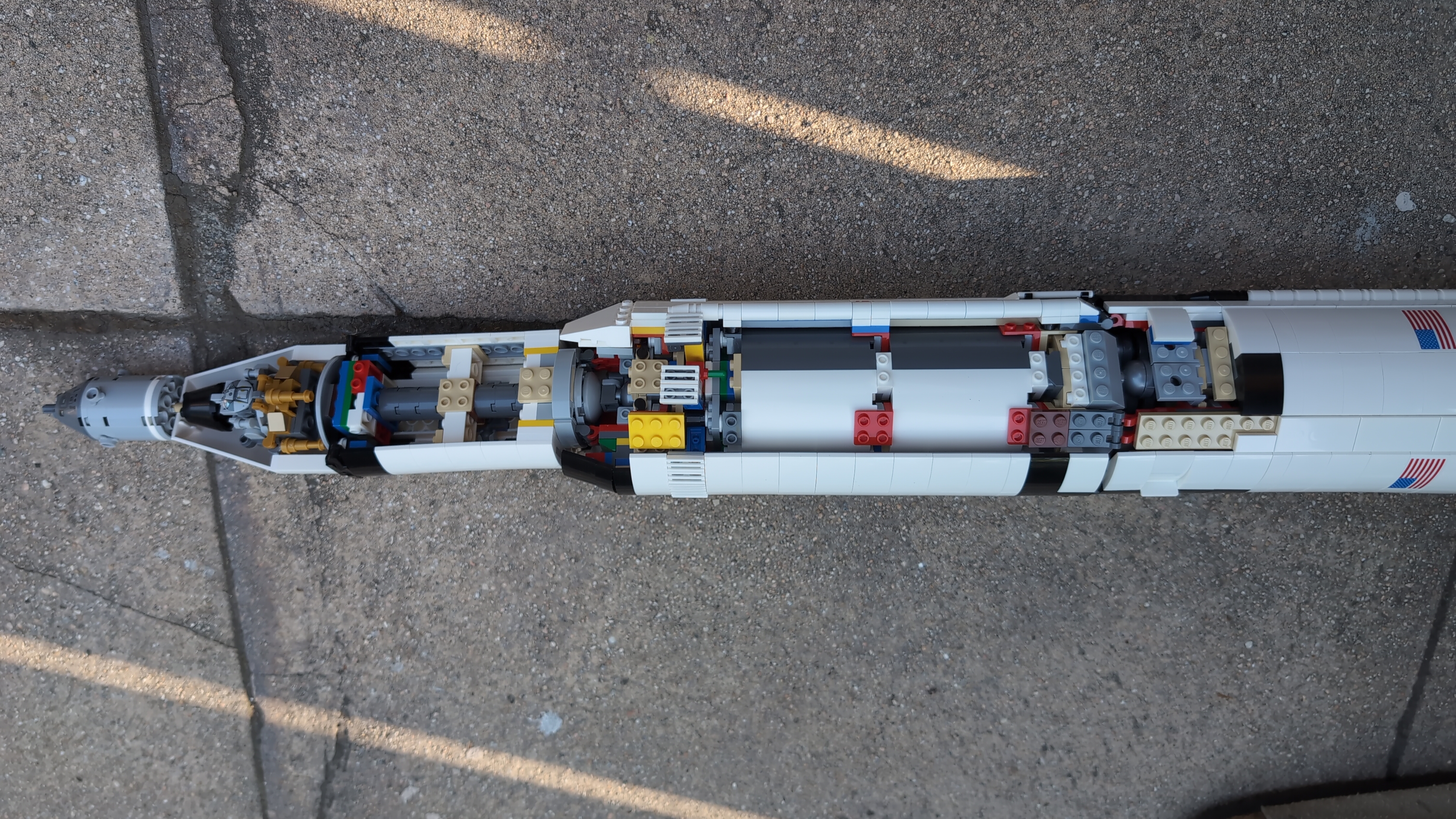 Picture of the Lego Apoolo - Saturn V rocket with most of its insides showing.