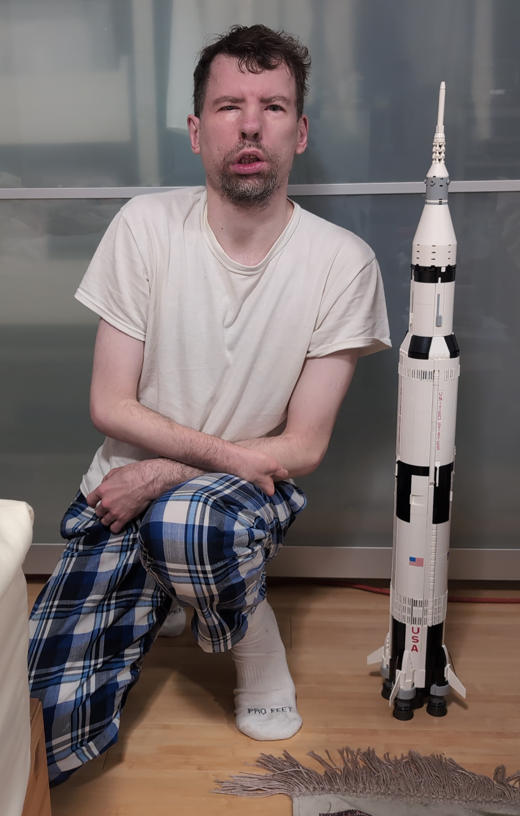 Picture of me crouching nest to the Lego Apoolo - Saturn V rocket in launch configuration which is aboutt as tall as me crouching.