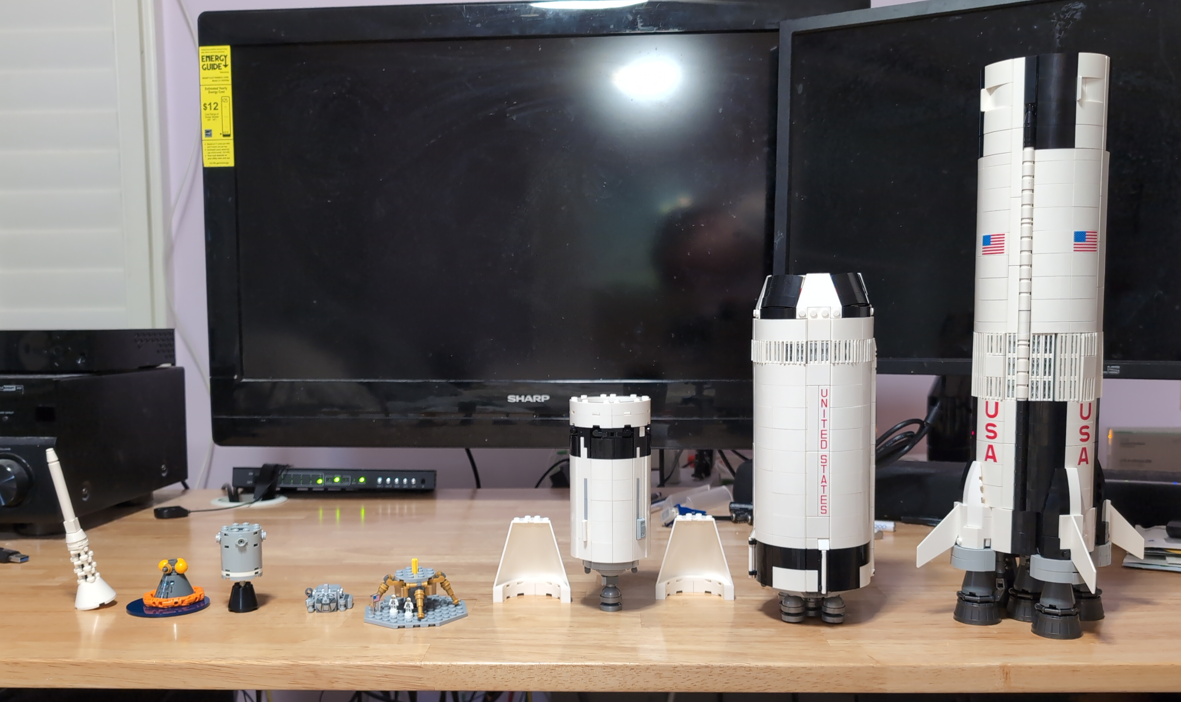 Picture of the Lego Apoolo - Saturn V rocket broken into all the pieces it breaks into during its mission. From left to right in the picture: